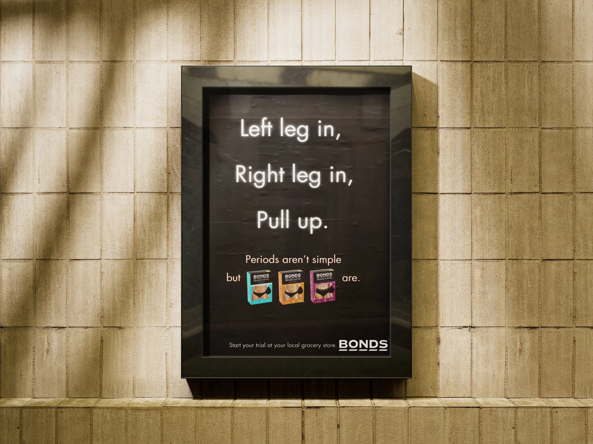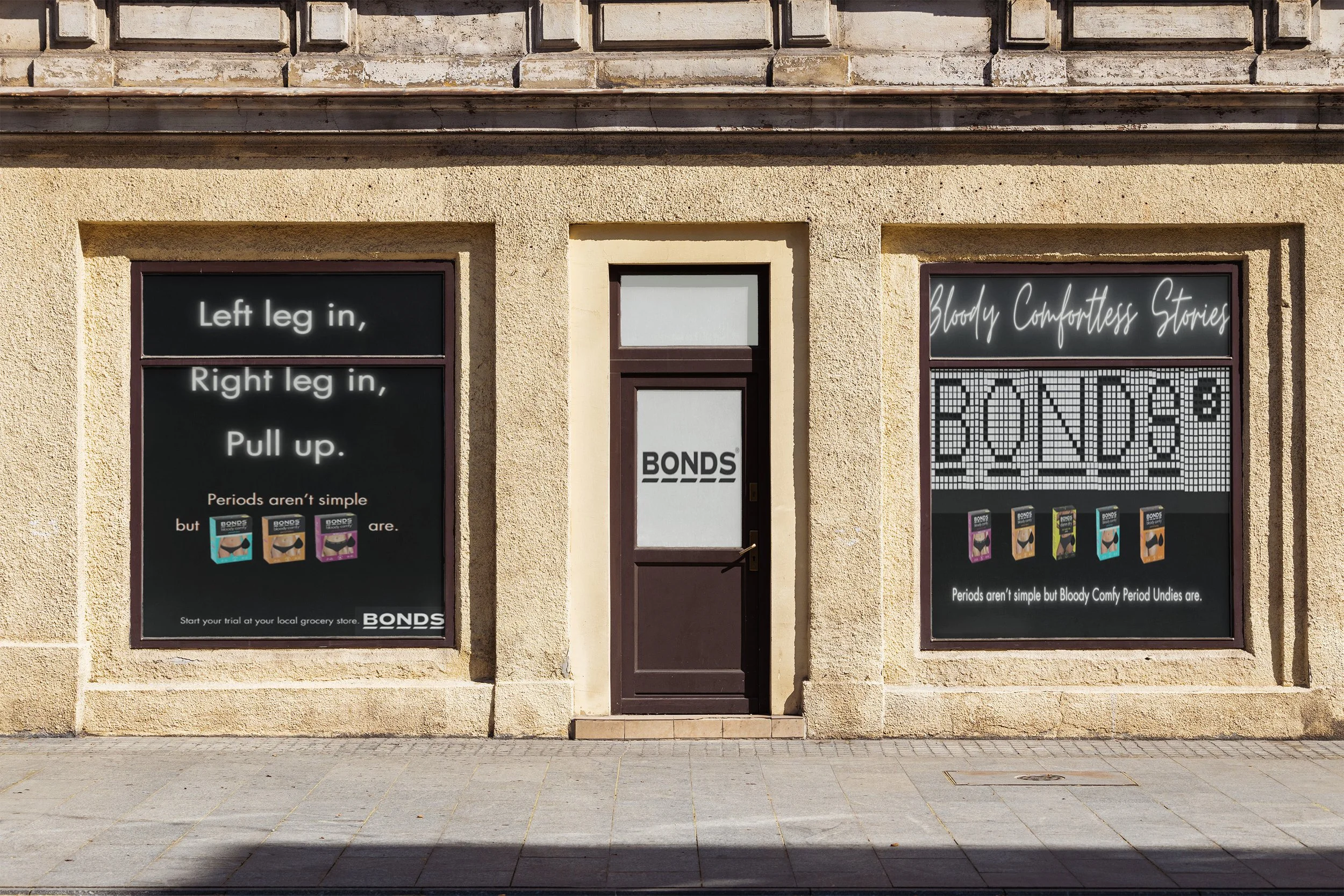 This will expand into social media with the #Bloodycomfortlessstories. Encouraging people to share their own period stories on social media as well as pictures of the window display. BONDS will be giving away pairs of BCPU's to the top 10 stories and use them in the TVC.